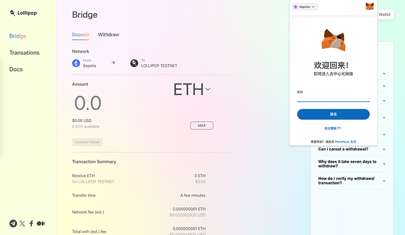 - First and foremost, it’s important to be connected to your blockchain wallet. Lollipop Bridge supports only MetaMask as the wallet at the moment.