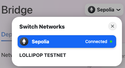 To use testnet, change your network to Sepolia or Lollipop Testnet using the MetaMask UI. To switch back to mainnet, change your network to Ethereum or Lollipop using the same UI.